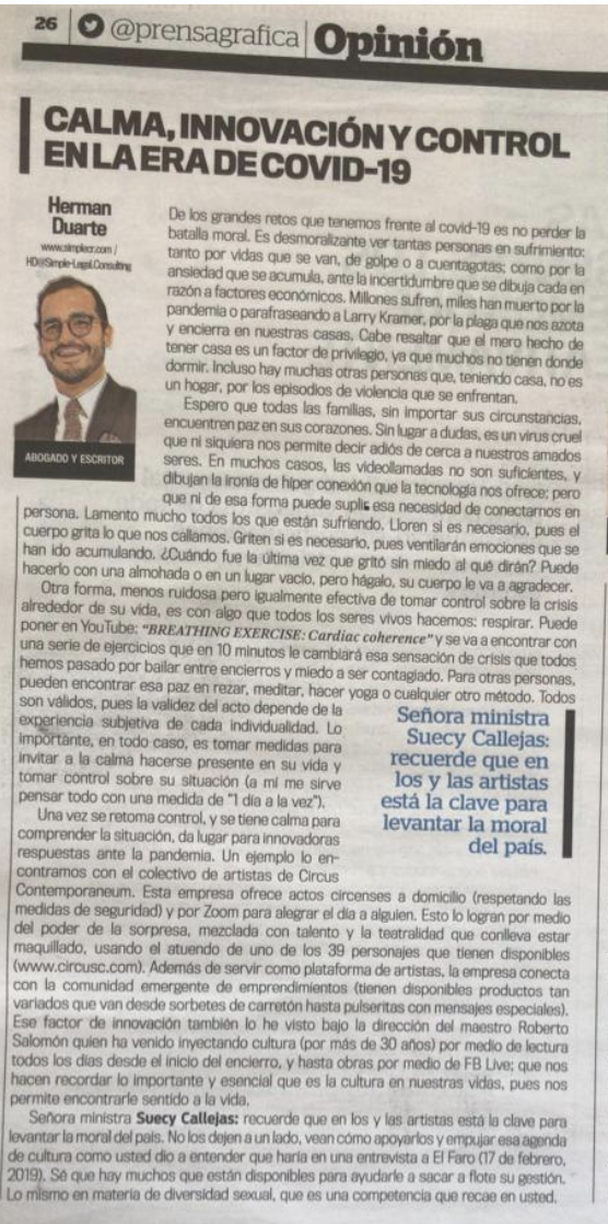 "Calma, Innovación y control en la era de Covid19" se titula el nuevo artículo de nuestro director legal, Herman Duarte, publicado en La Prensa Gráfica este 14 de julio del 2020.